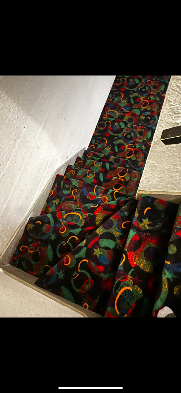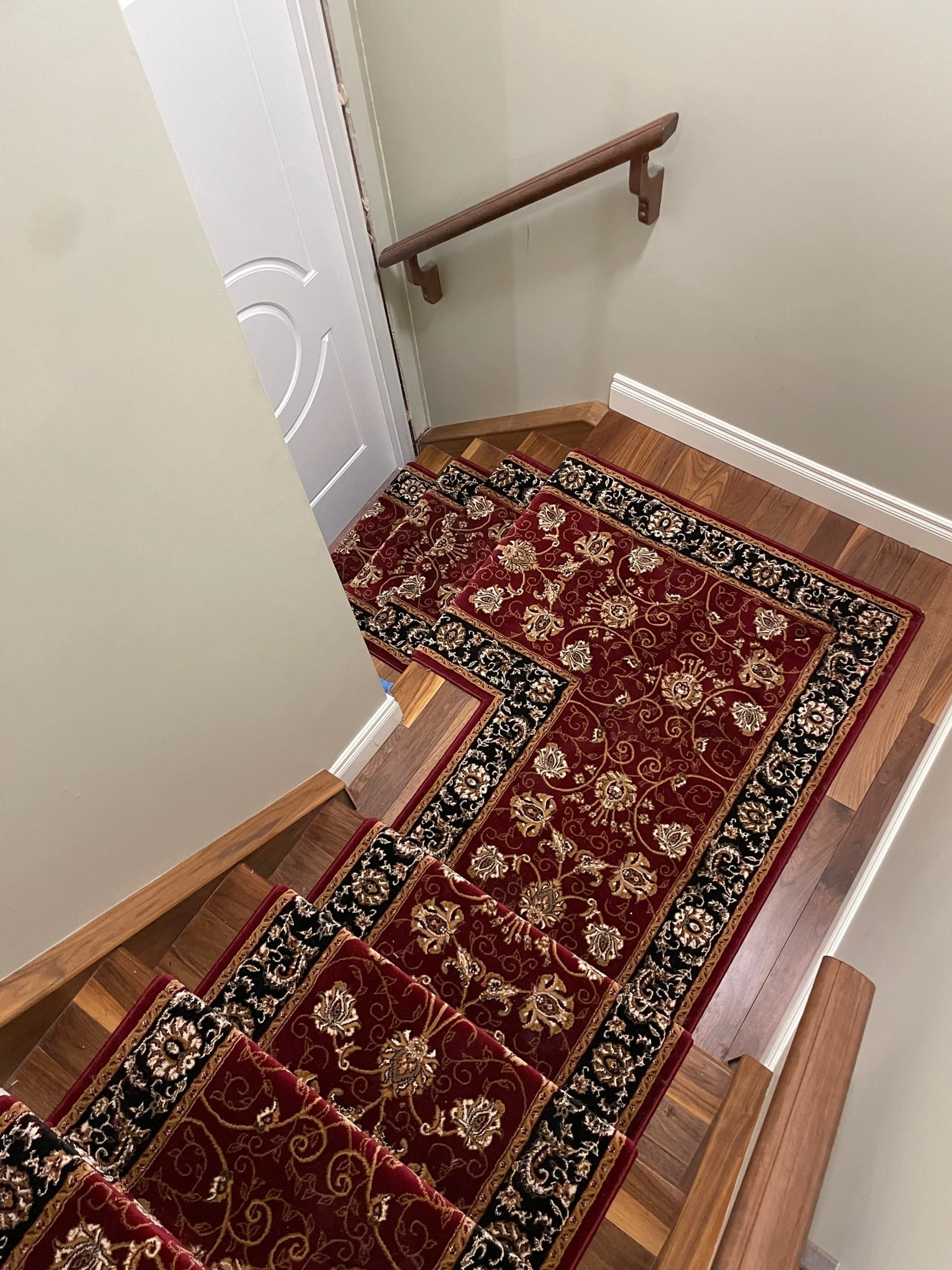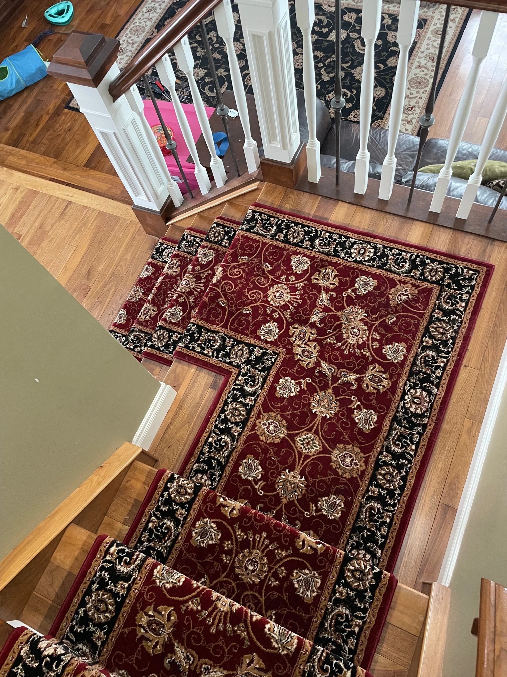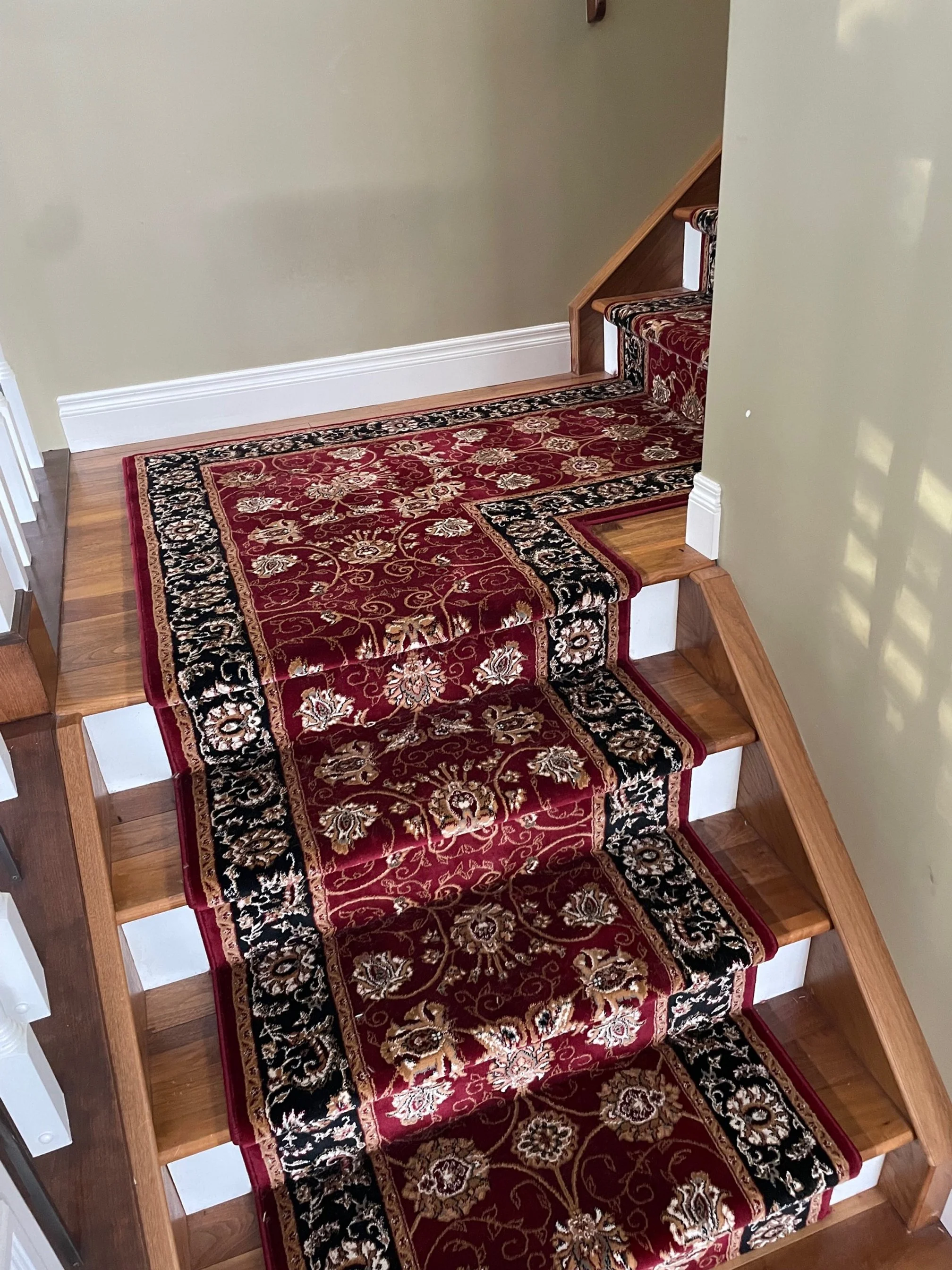 Custom stair runner installed with precise pattern matching, combining safety, comfort, and a stylish, seamless design that enhances the staircase’s look.