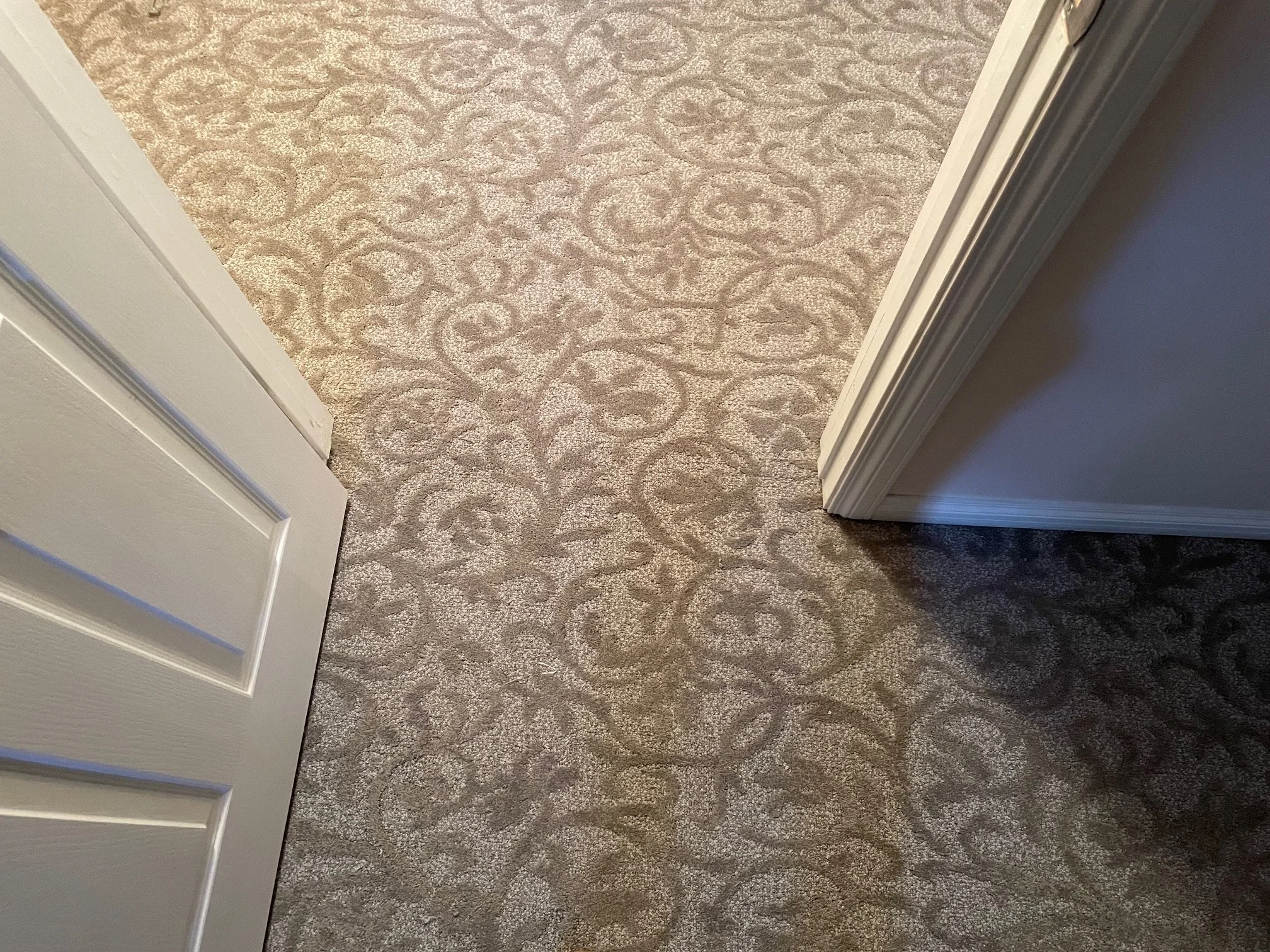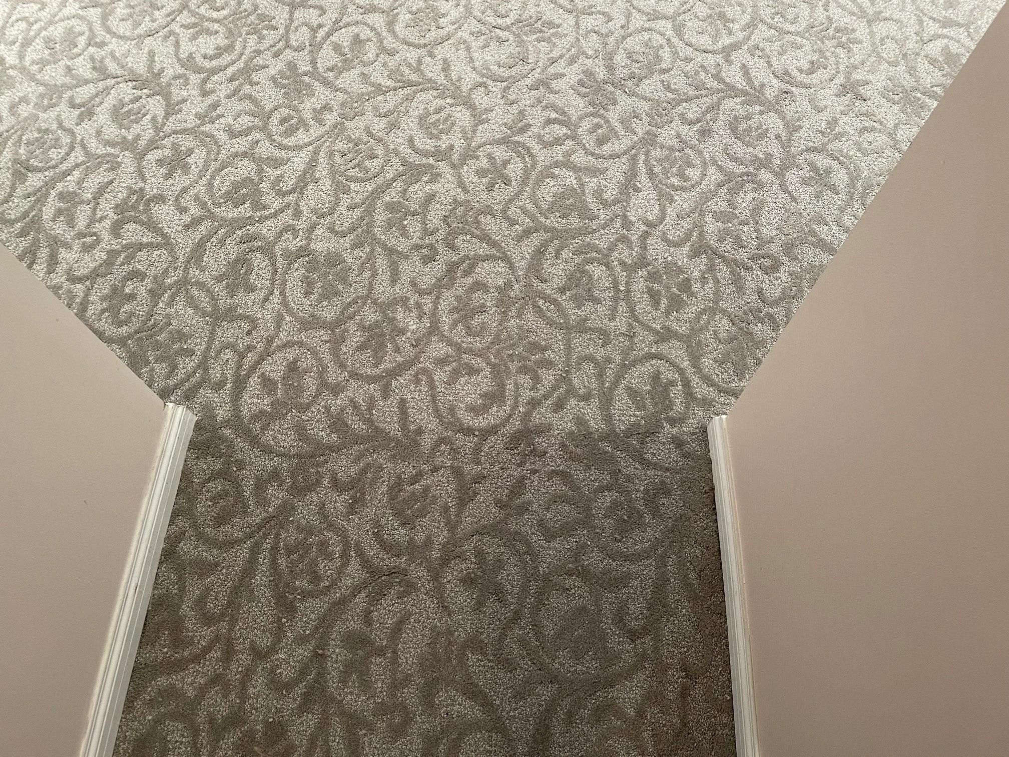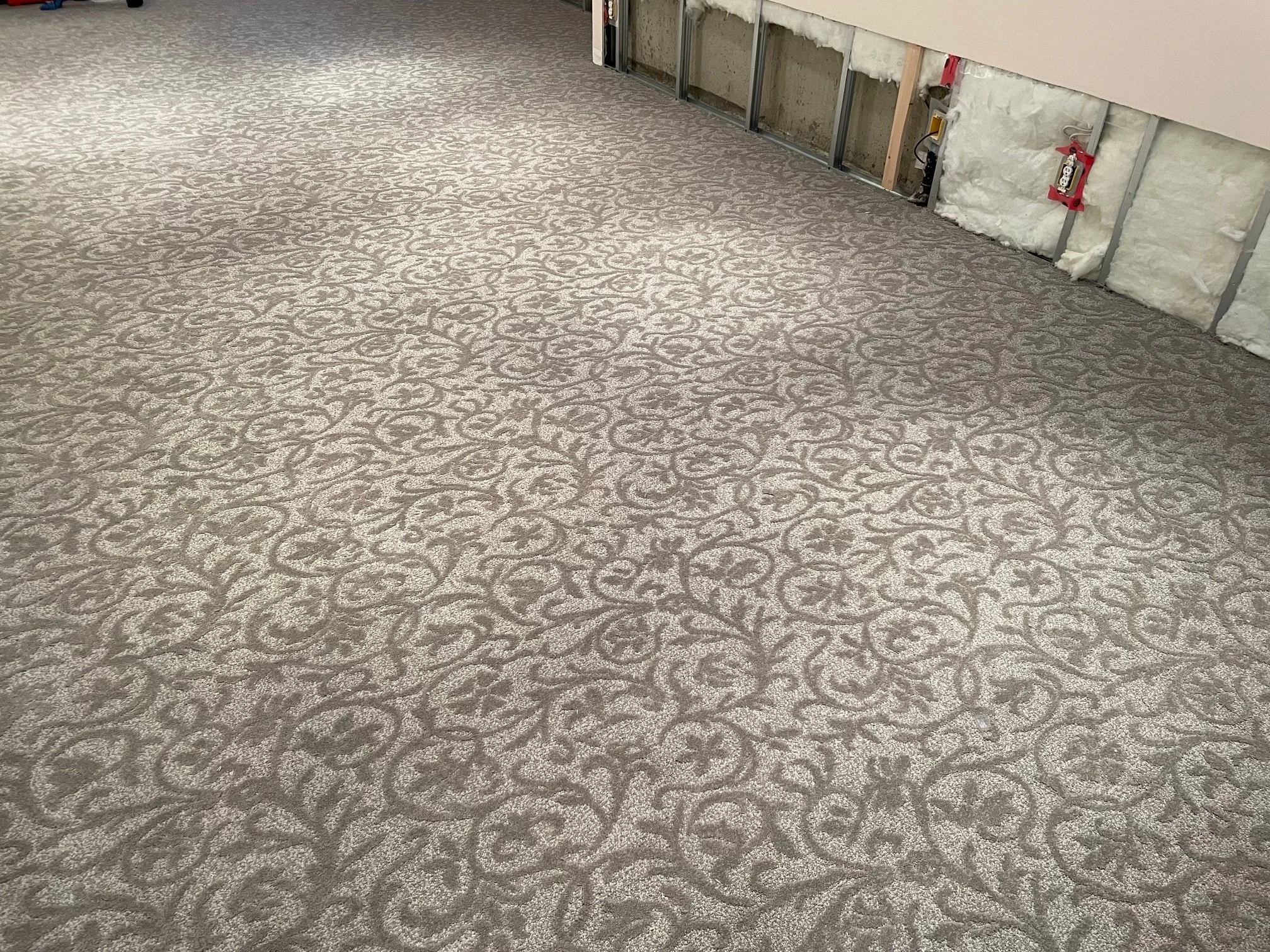 Expertly installed carpet in the basement with precise pattern matching, creating a seamless, stylish, and comfortable flooring solution that elevates the space.