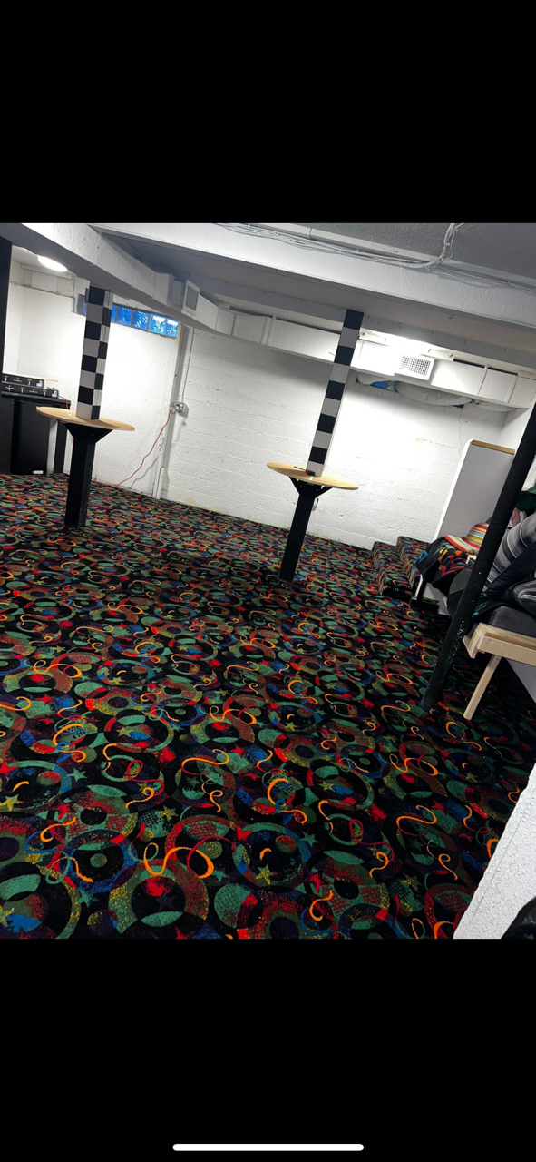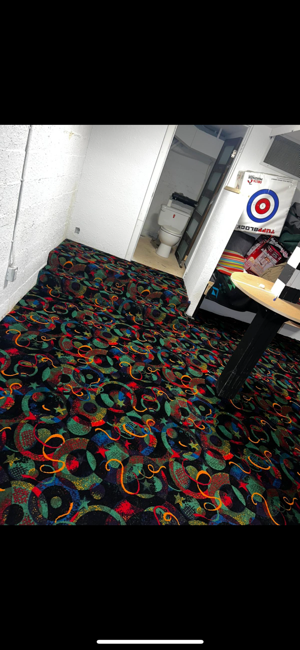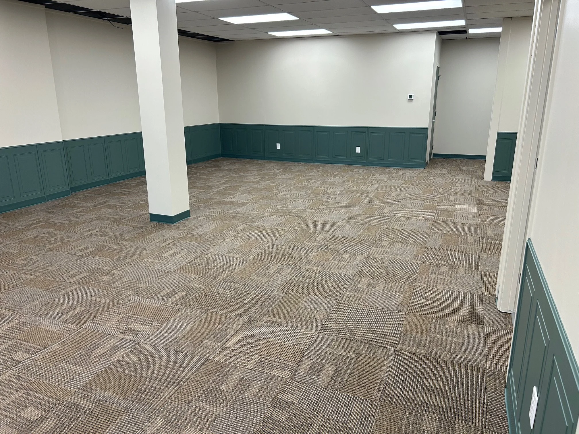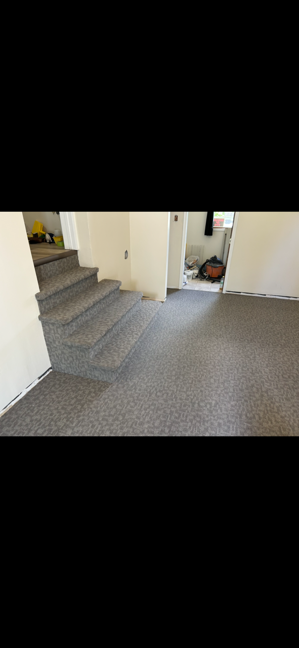 Expertly installed carpet in the basement with precise pattern matching, creating a seamless, stylish, and comfortable flooring solution that elevates the space.