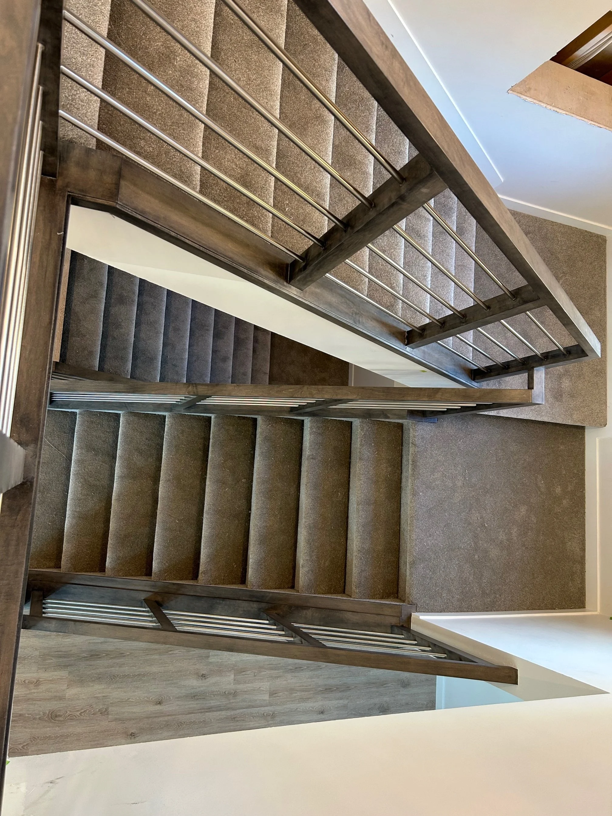 Sleek and contemporary staircase upgraded with high-quality carpeting for safety, comfort, and a stylish finish. Perfect blend of modern design and durability.
