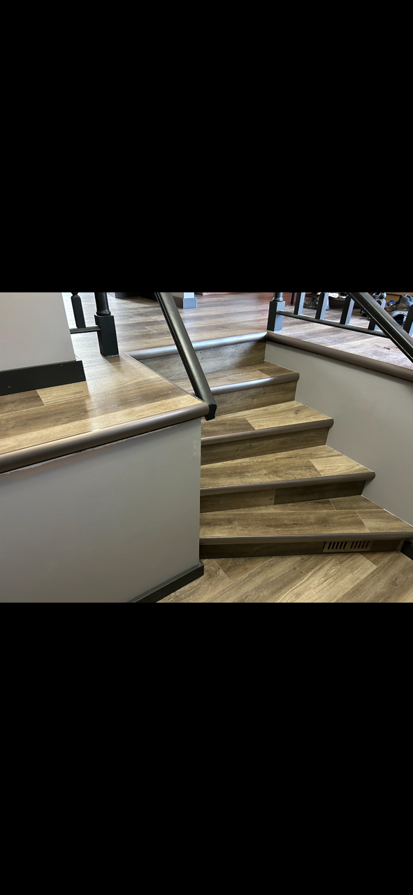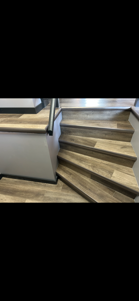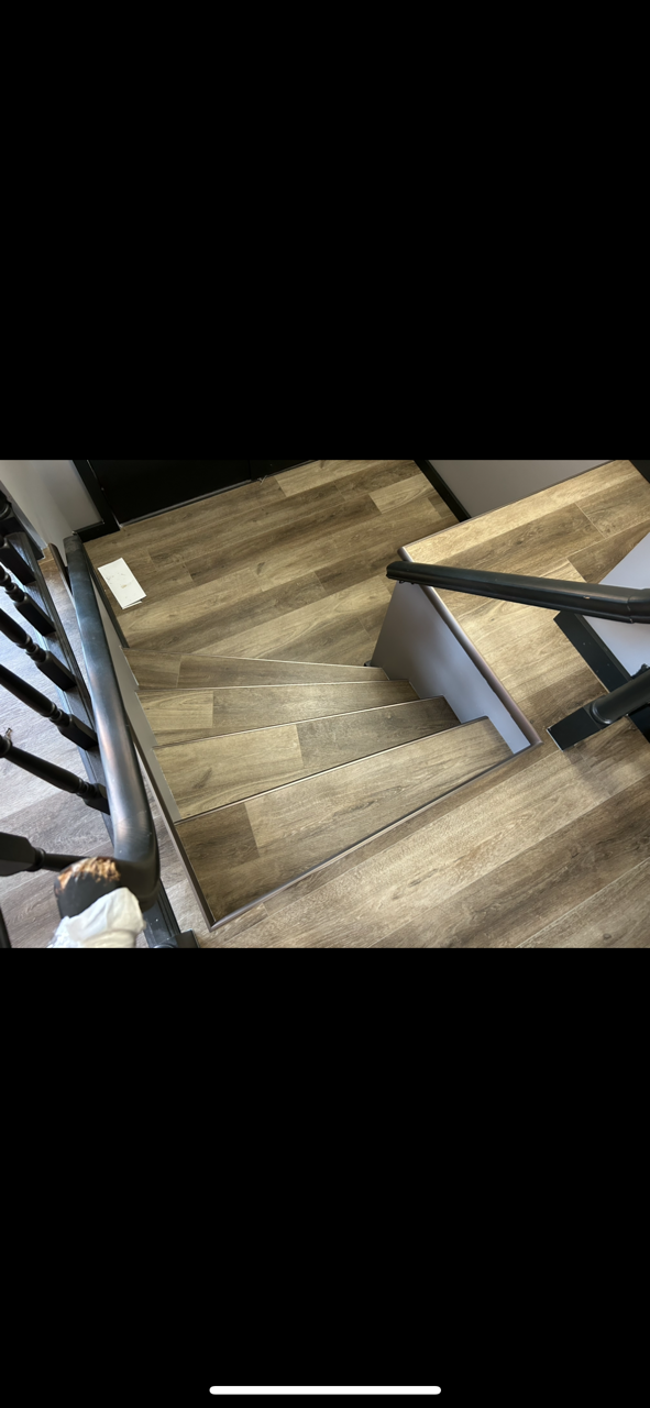 Seamless vinyl installation on a curved staircase with landing, combining elegance, durability, and a smooth, modern finish.