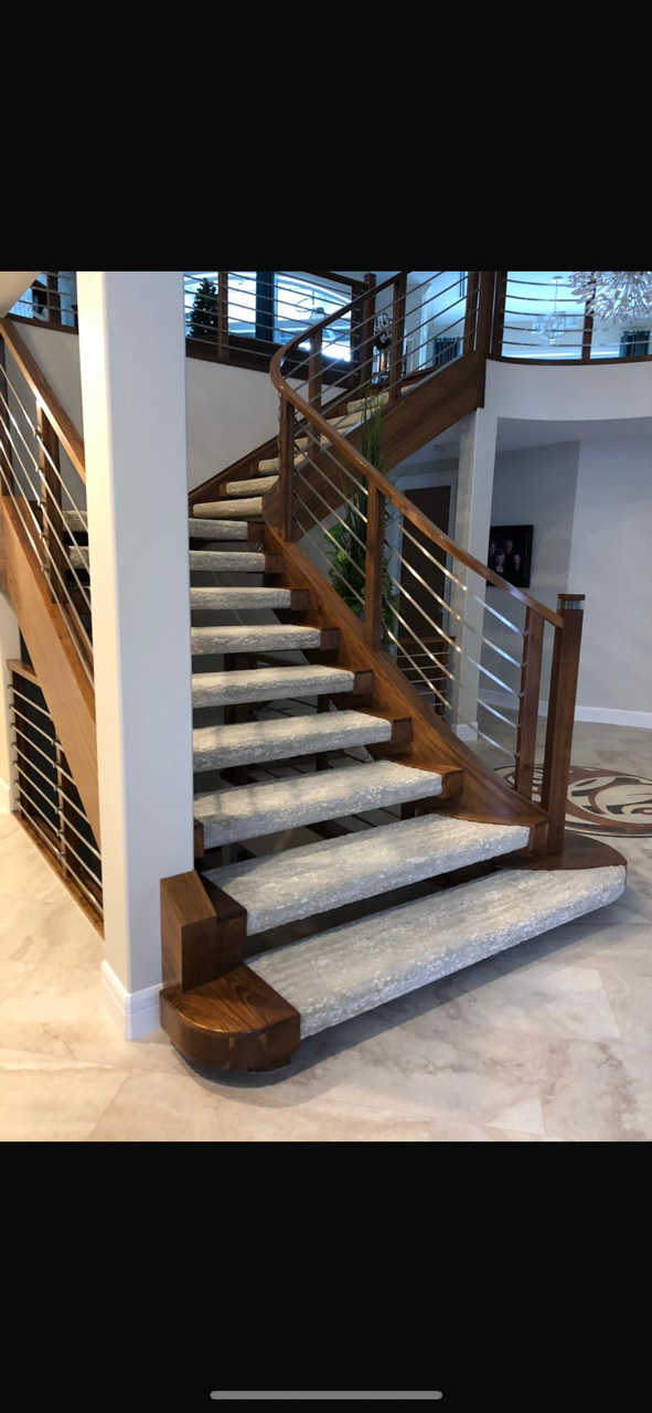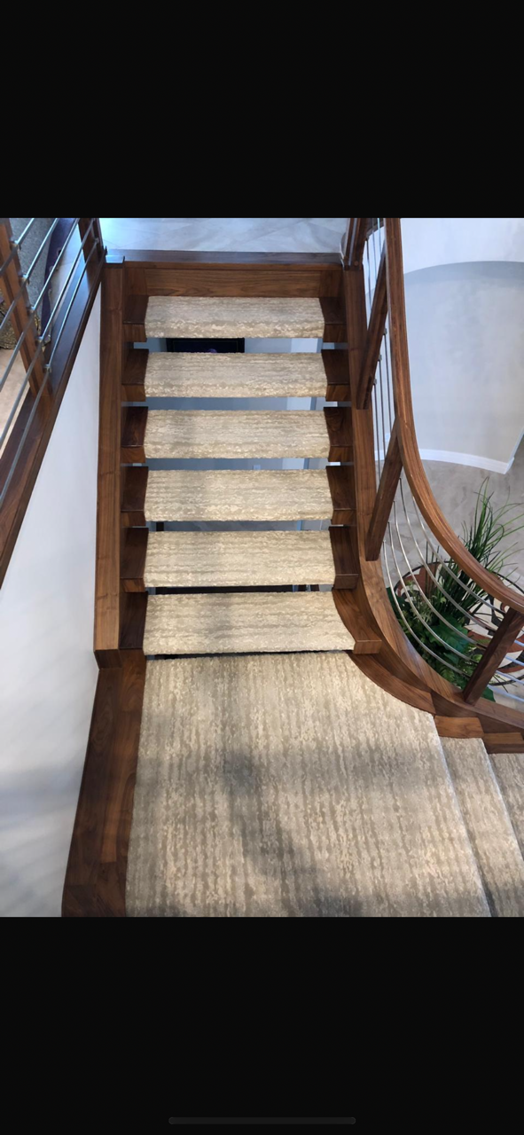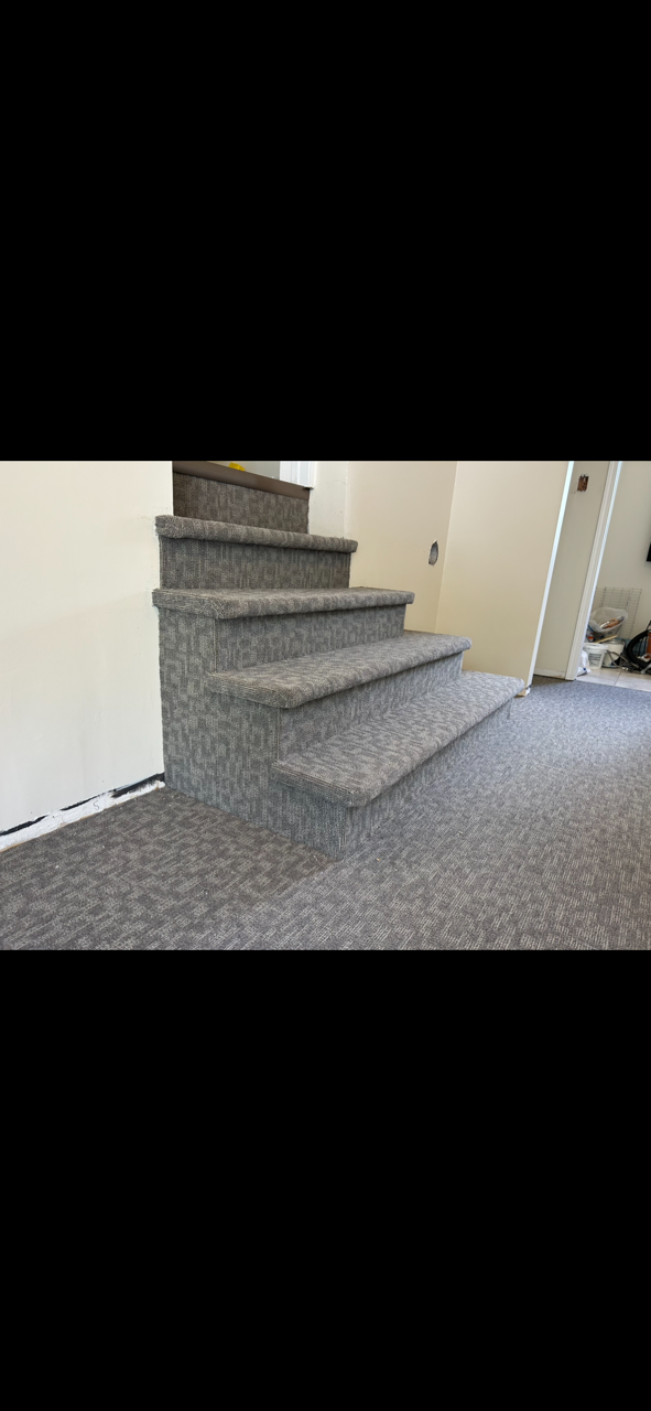 This project features a modern floating staircase seamlessly wrapped in premium carpet. The design combines contemporary minimalism with comfort, softening the sharp architectural lines while providing durability and traction. Each step was finished with precision for a clean, seamless look that blends into the surrounding space.
