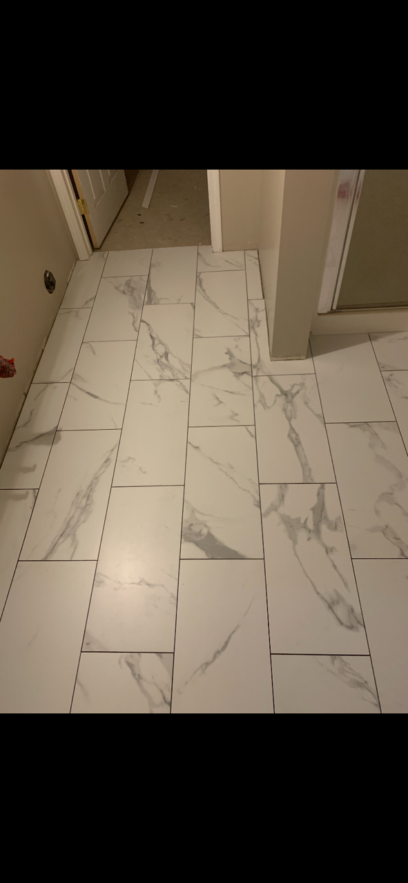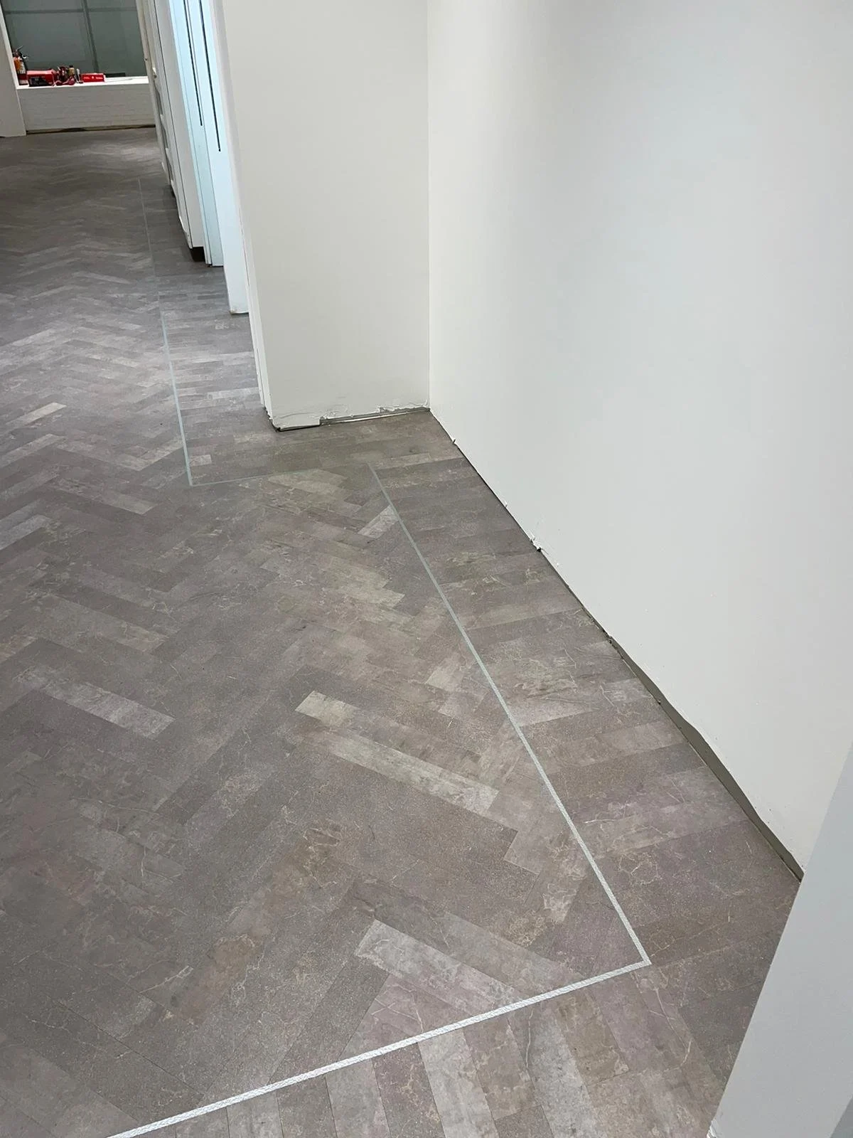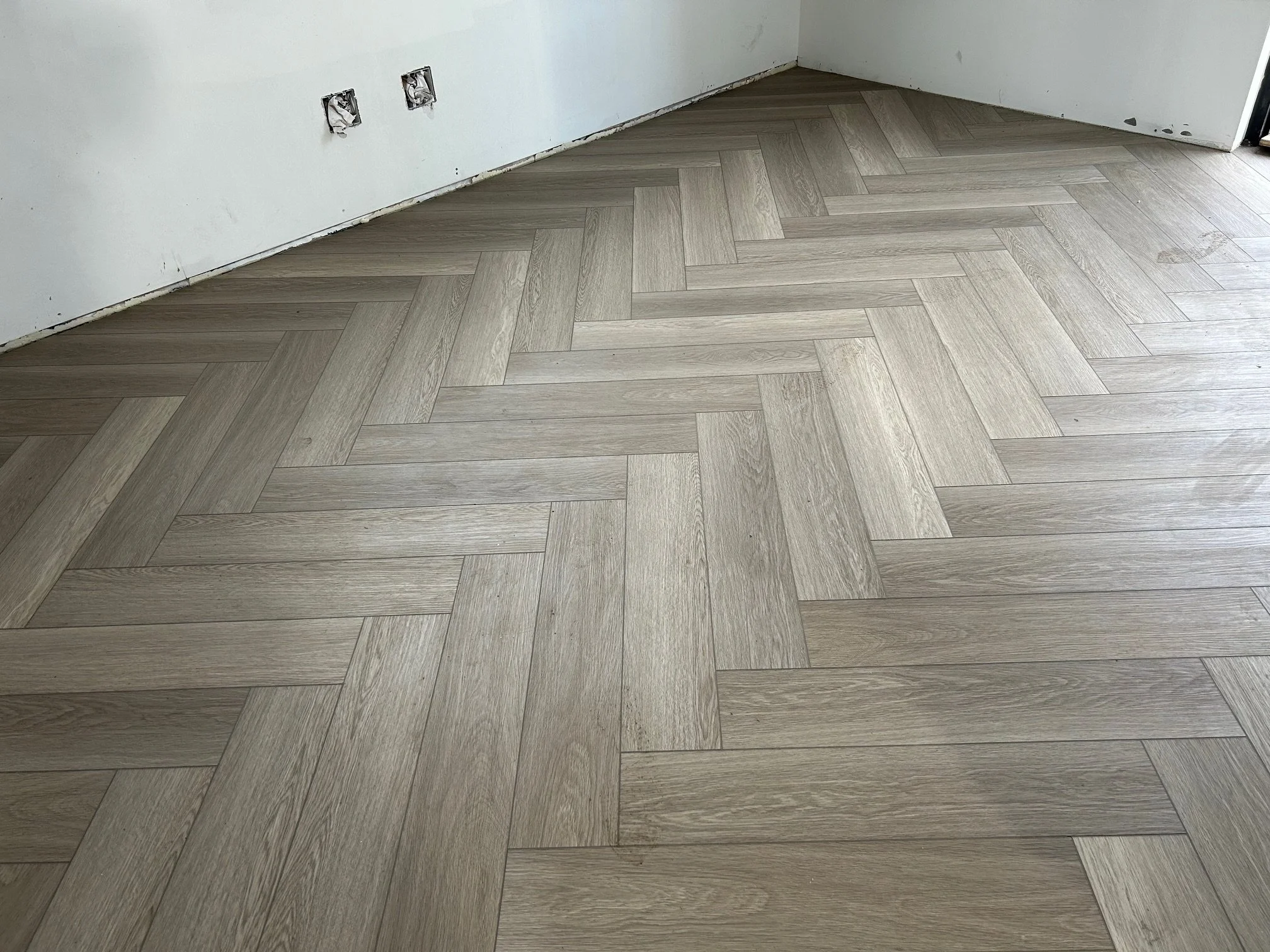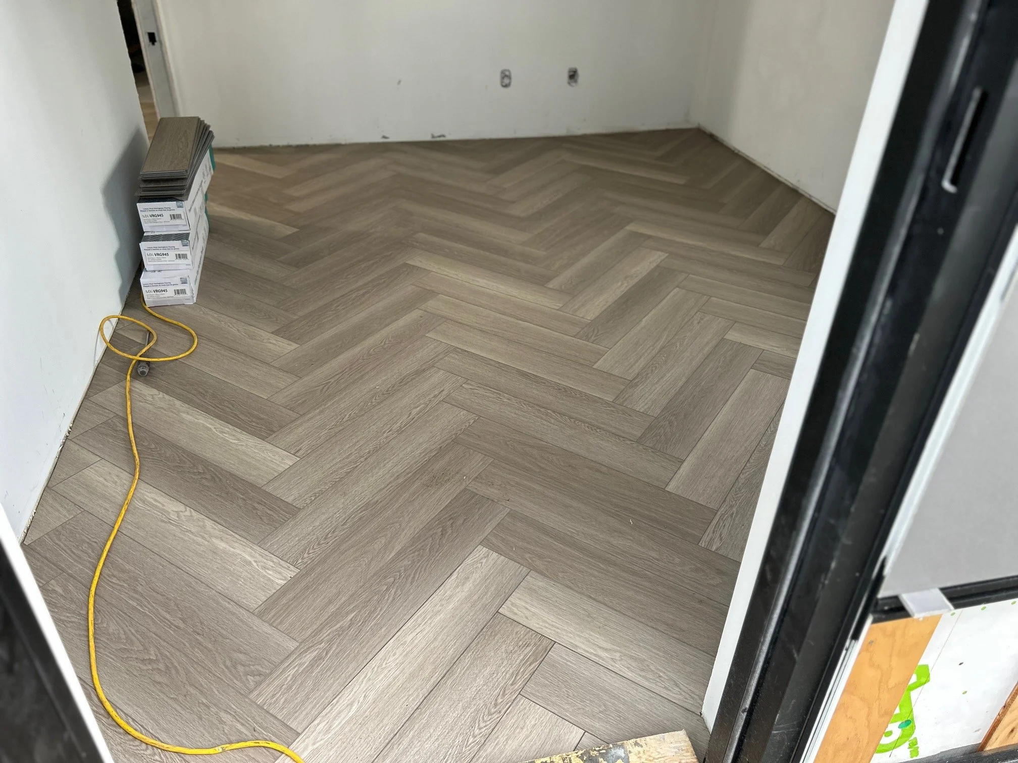 Expertly installed herringbone-patterned vinyl flooring, adding a modern and elegant touch to any space while ensuring durability and easy maintenance.
