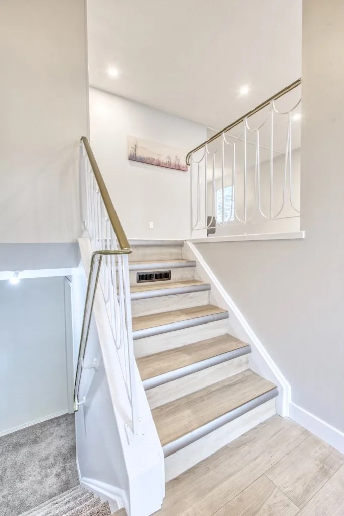 Elegant carpet installation that flows from the main floor to the stairs, creating a cohesive, stylish, and comfortable look throughout the space.