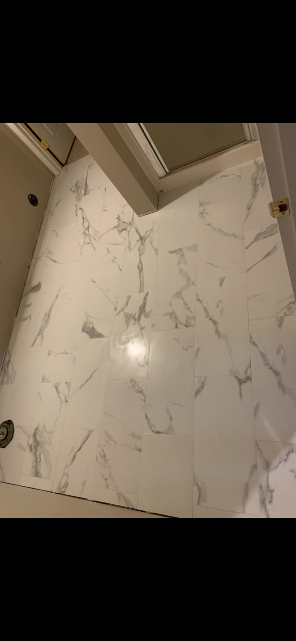 High-quality Calacatta-style porcelain tiles installed to create a bright, elegant, and durable bathroom space, combining timeless style with easy maintenance.